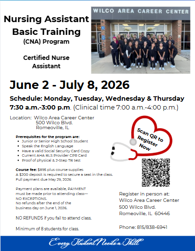 The Wilco High School Summer Certified Nursing Assistant (CNA) Program is designed to provide comprehensive training for individuals seeking to become Certified Nursing Assistants. This program offers a blend of classroom instruction, hands-on lab experience, and clinical practice to ensure participants are well-prepared for the CNA certification exam and a rewarding career in healthcare. Register Today and reserve your spot!